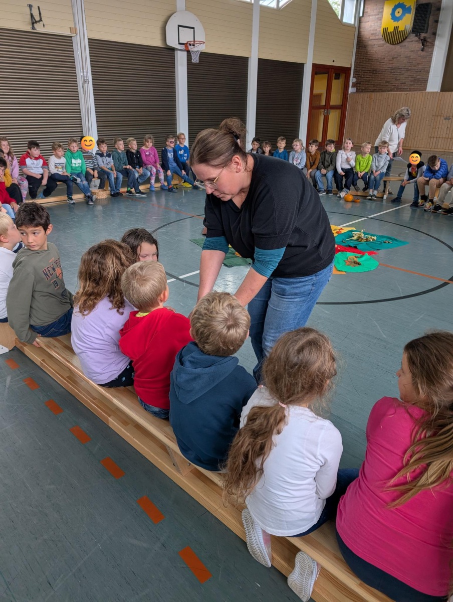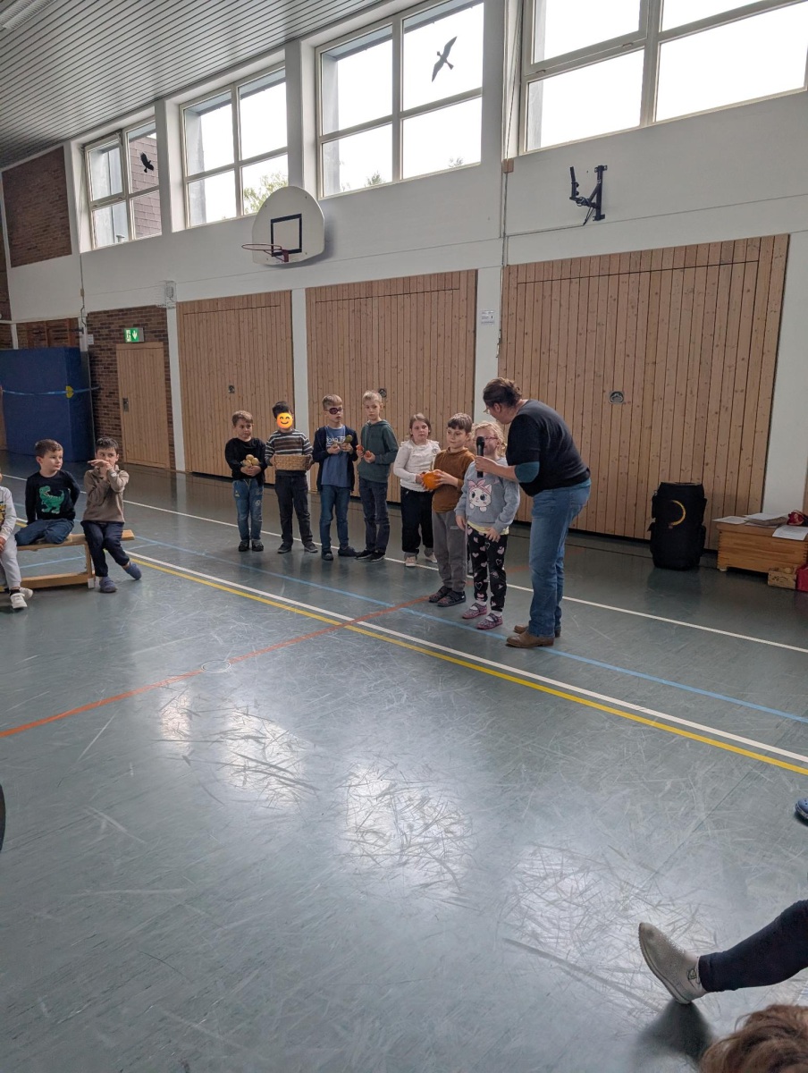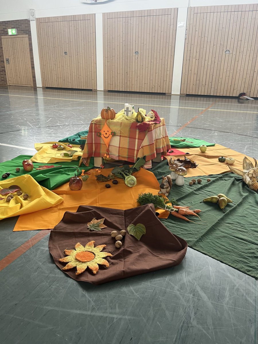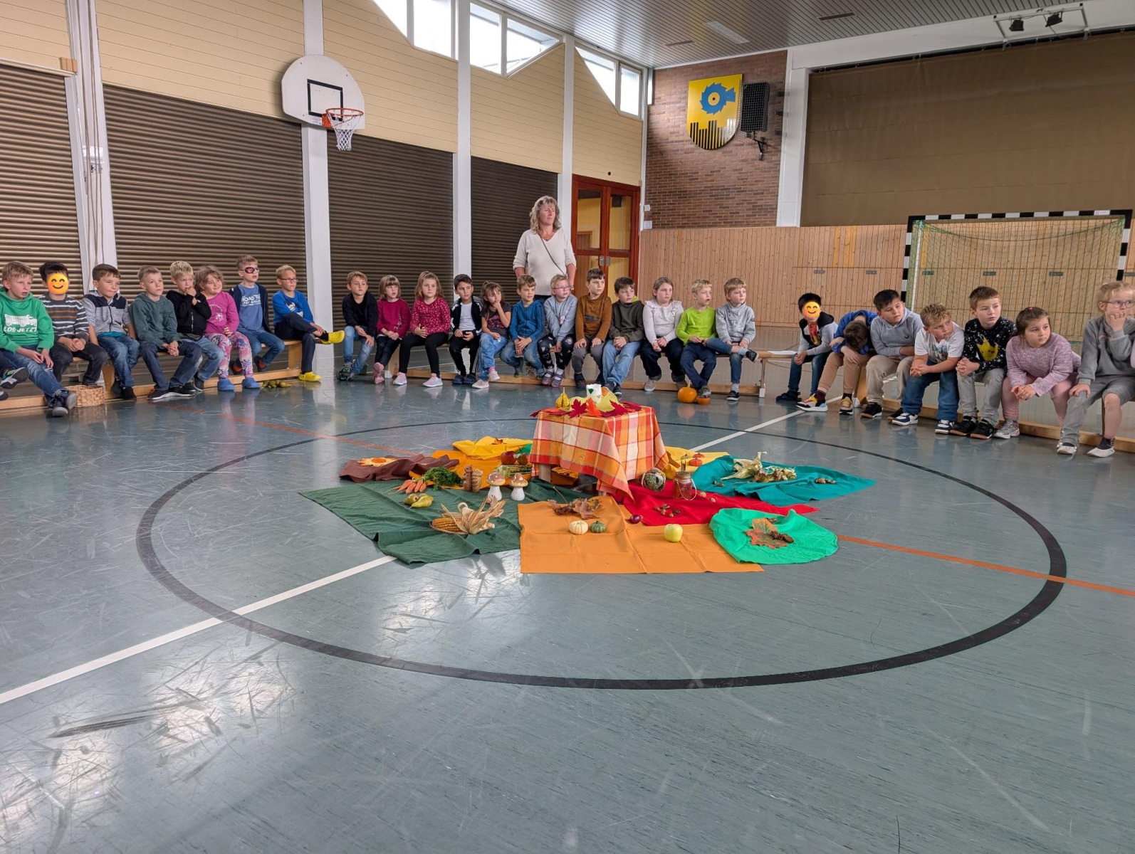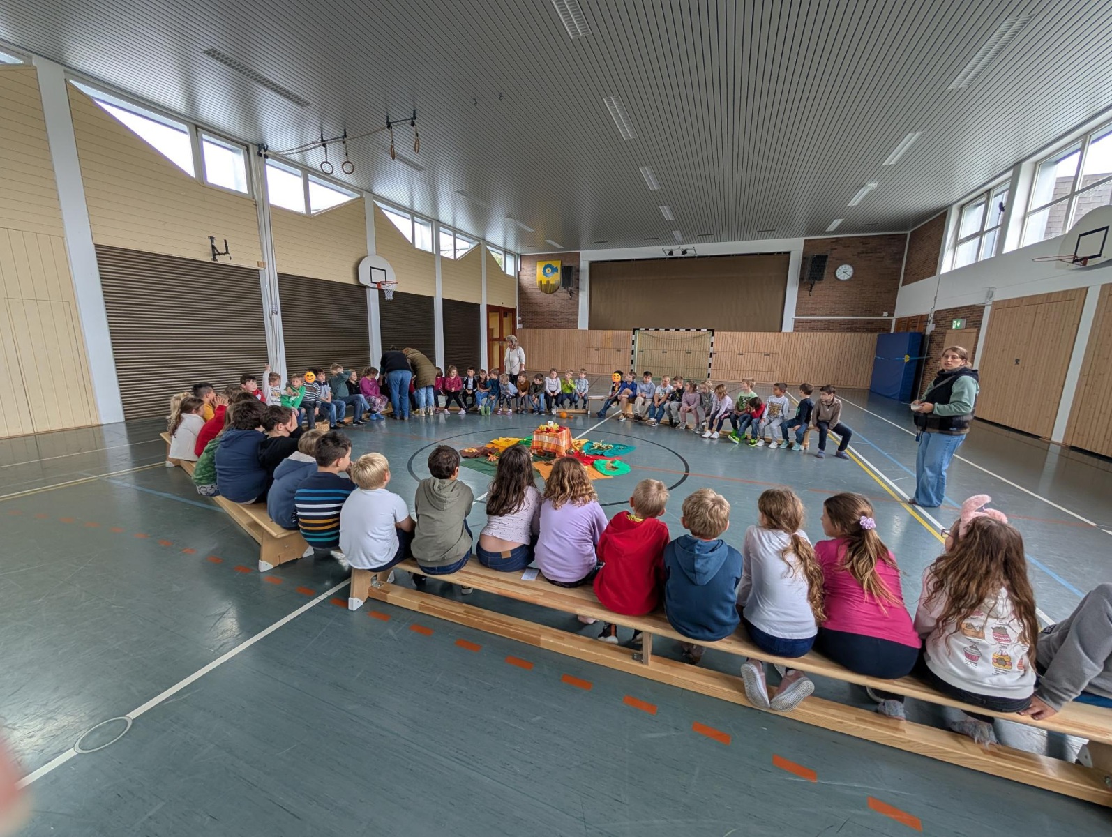 Unsere diesjährige Erntedankfeier stand ganz unter dem Motto „Vom Korn zum Brot“. Die Kinder der Klasse 2b führten uns vor, welche Schritte durchlaufen werden müssen, bis wir am Ende ein Brot im Laden kaufen können. Sie führten uns vor Augen, dass unser Dank nicht nur dem Lieferanten des Brotes oder dem Bäcker oder dem Müller gebührt, sondern auch dem Bauern, der das Korn gesät hat und Gott, der das Getreide hat wachsen lassen. Die Kinder zeigten sich auch dankbar für die Ernte von Obst und Gemüse. Sie brachten Pflaumen, Äpfel, Birnen, Gurken, Kartoffeln und einen Kürbis mit. Die Kinder der Klasse 2a bedankten sich in einem Gebet für die gute Ernte und die Menschen, die bei der Ernte geholfen haben. Wir sangen das Lied „Wenn jeder gibt, was er hat“ und erinnern uns daran, dass wir das, was wir haben, teilen, damit alle satt werden können. Jede Klasse erhielt zum Abschluss unserer Erntedankfeier ein Brot, das sie anschließend, wie im Lied gesungen, geteilt haben.