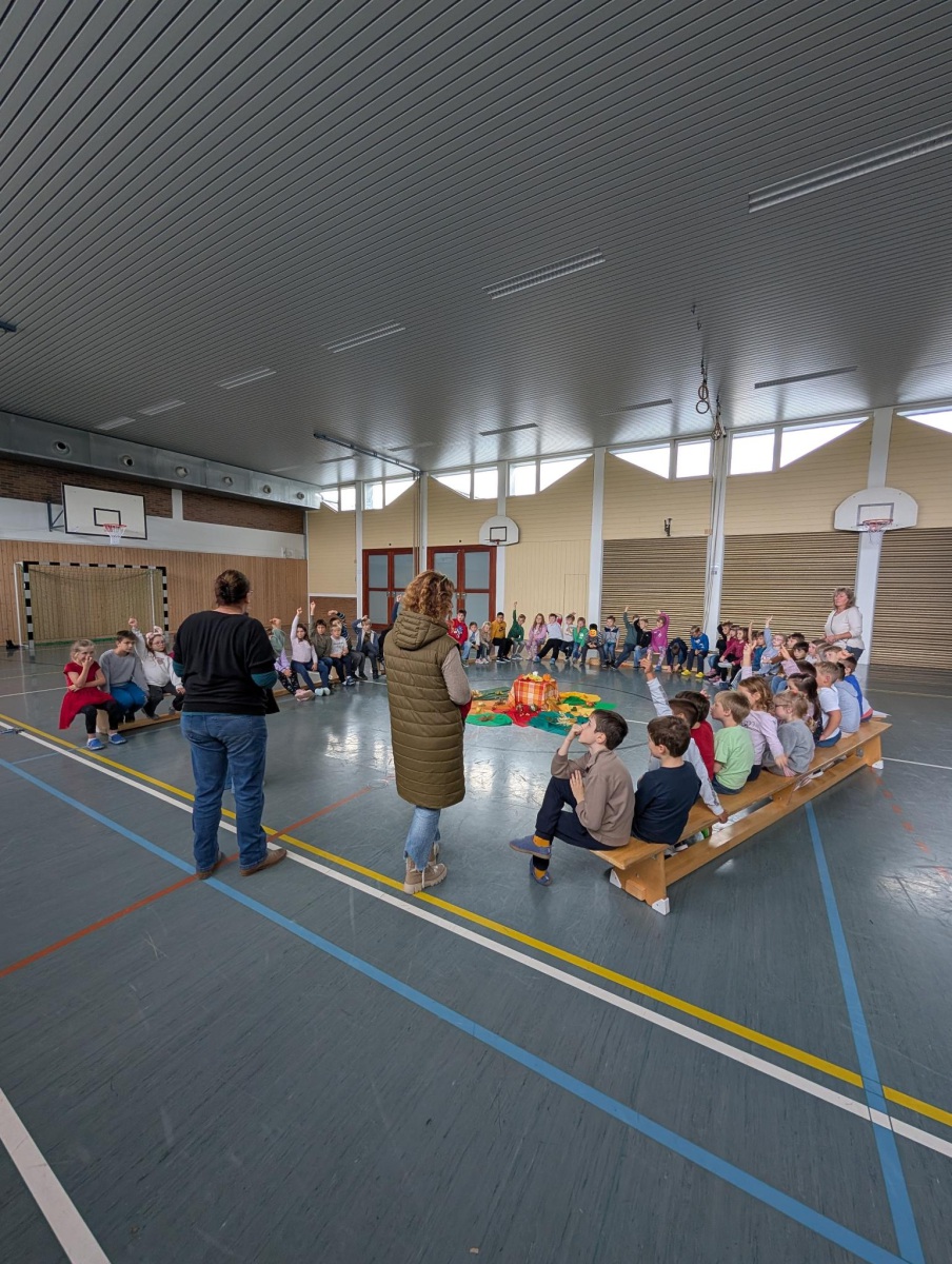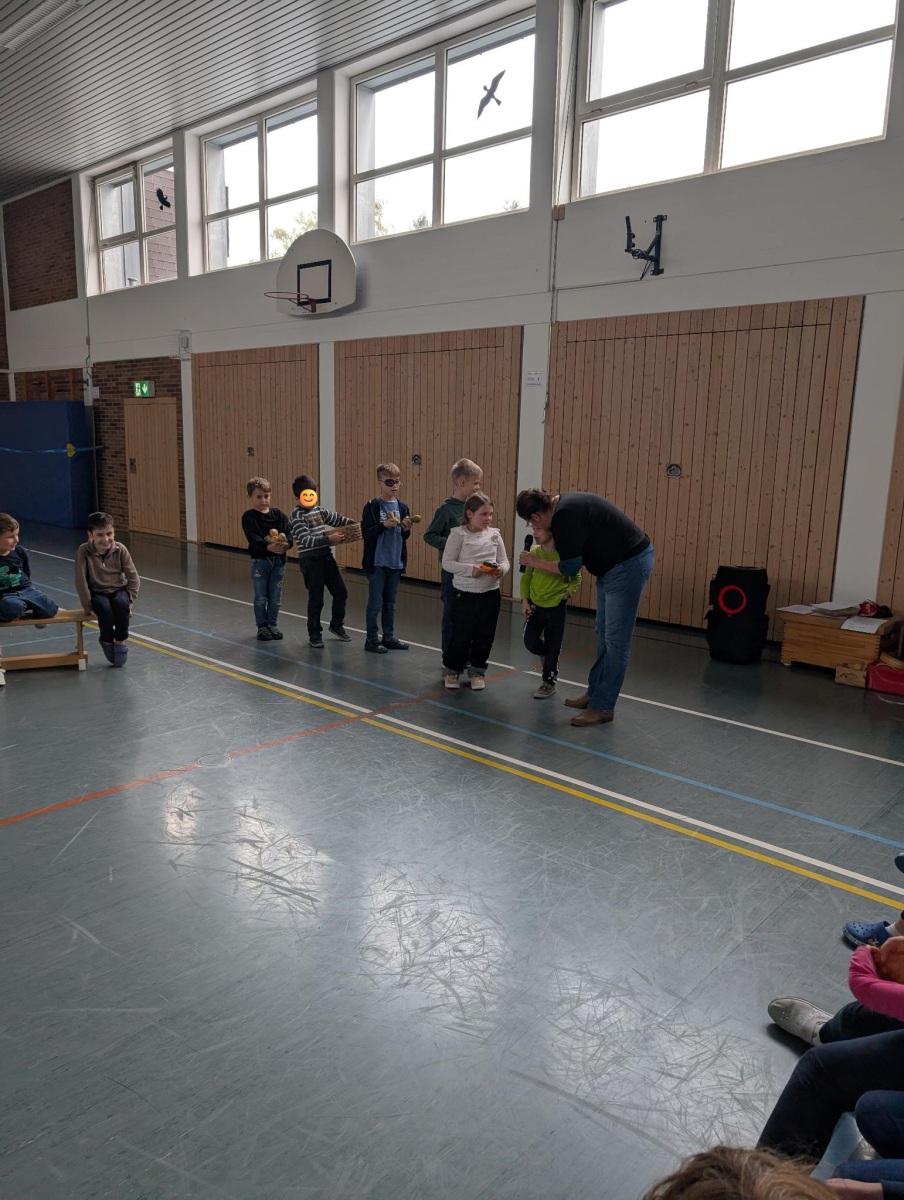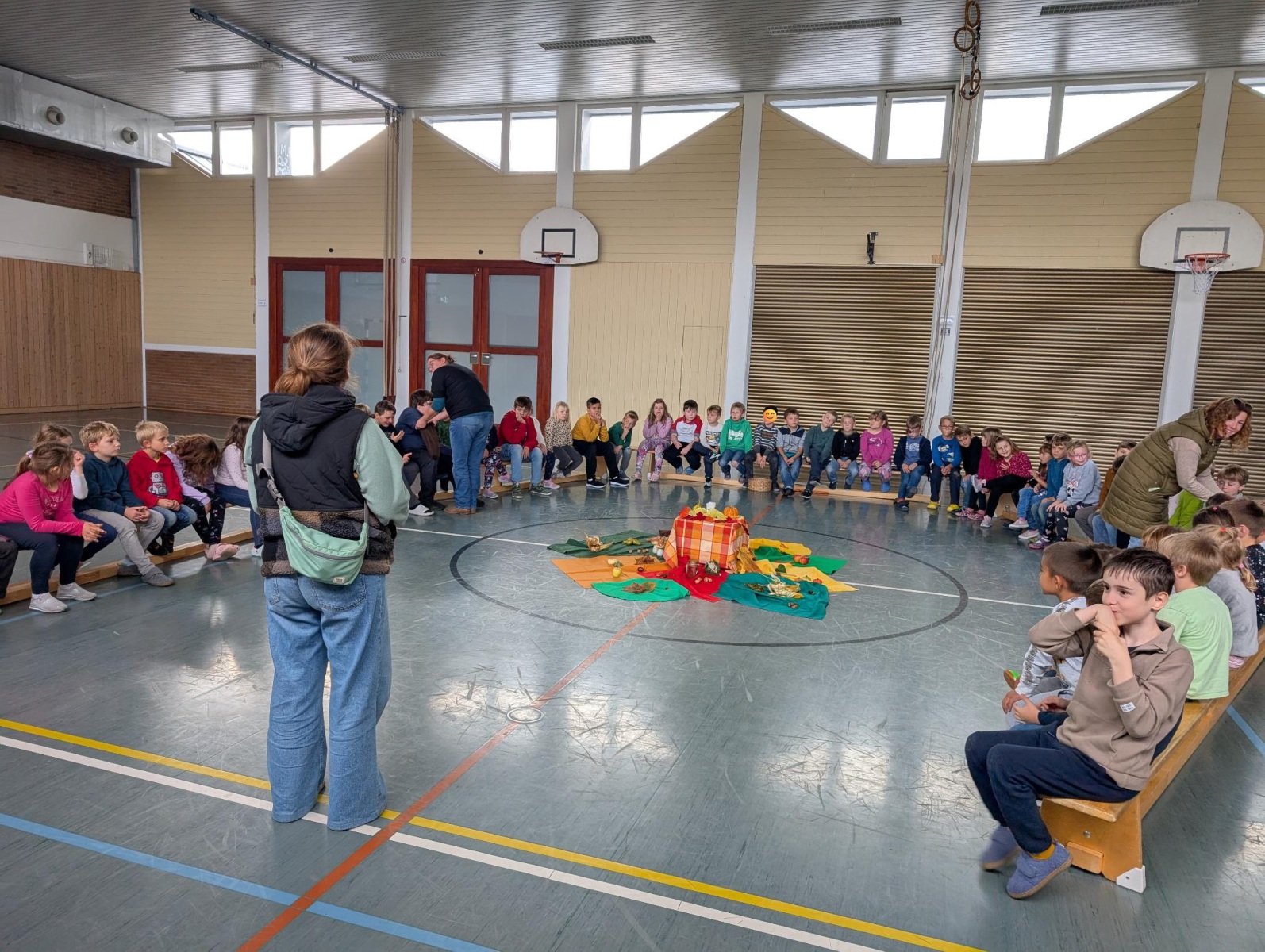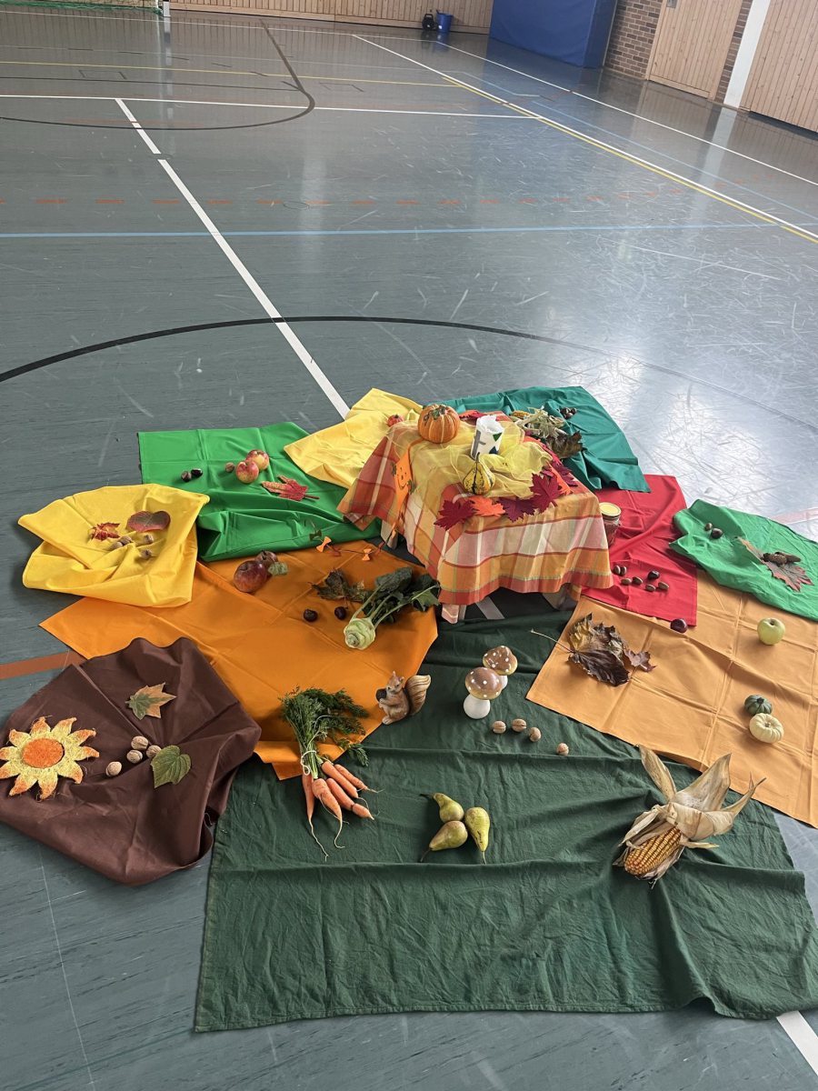 Unsere diesjährige Erntedankfeier stand ganz unter dem Motto „Vom Korn zum Brot“. Die Kinder der Klasse 2b führten uns vor, welche Schritte durchlaufen werden müssen, bis wir am Ende ein Brot im Laden kaufen können. Sie führten uns vor Augen, dass unser Dank nicht nur dem Lieferanten des Brotes oder dem Bäcker oder dem Müller gebührt, sondern auch dem Bauern, der das Korn gesät hat und Gott, der das Getreide hat wachsen lassen. Die Kinder zeigten sich auch dankbar für die Ernte von Obst und Gemüse. Sie brachten Pflaumen, Äpfel, Birnen, Gurken, Kartoffeln und einen Kürbis mit. Die Kinder der Klasse 2a bedankten sich in einem Gebet für die gute Ernte und die Menschen, die bei der Ernte geholfen haben. Wir sangen das Lied „Wenn jeder gibt, was er hat“ und erinnern uns daran, dass wir das, was wir haben, teilen, damit alle satt werden können. Jede Klasse erhielt zum Abschluss unserer Erntedankfeier ein Brot, das sie anschließend, wie im Lied gesungen, geteilt haben.