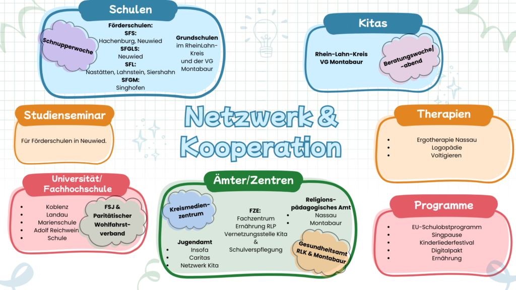 Sprachstörungen können nie isoliert betrachtet werden. Ihre Ursachen liegen häufig in sprachtragenden Grundlagen wie Wahrnehmung, Kognition oder der sozial-emotionalen Situation, und sie wirken sich wiederum auf andere Entwicklungsbereiche aus. Um dieser Komplexität im Sinne einer ganzheitlichen Sichtweise der kindlichen Persönlichkeitsentwicklung gerecht zu werden, ist uns die interdisziplinäre Zusammenarbeit besonders wichtig: